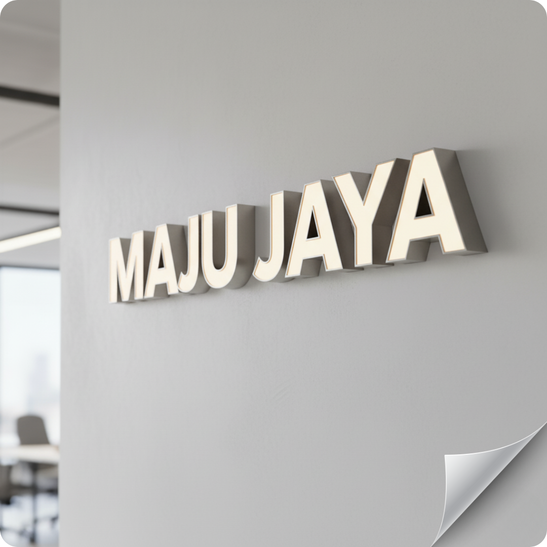 Huruf timbul akrilik nyalanya elegan, tidak silau. Revisi desain cepat, hasil rapi. Recommended.