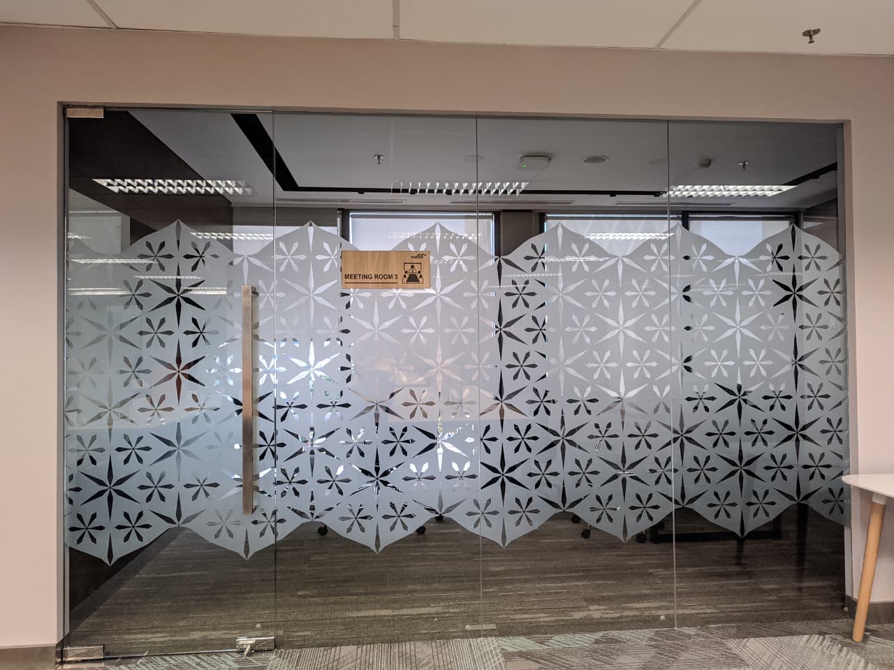 4. Sticker Sandblast Motif Custom Motif garis, geometris, floral, atau desain eksklusif sesuai konsep interior.